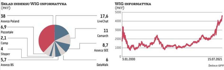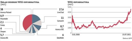 Na amerykańskiej giełdzie firmy technologiczne są motorem trwającej już ponadprzeciętnie długo hossy. Na GPW spółki tzw. nowej ekonomii z roku na rok są coraz ważniejszą częścią rynku, ale nadal mają zdecydowanie mniejszy wpływ na indeksy niż spółki SP. Firmy z sektora IT są zgrupowane we wskaźniku WIG-informatyka. Jego datą bazową jest 31 grudnia 1998 r. – wartość indeksu w tym dniu wynosiła 1279,56 pkt. Początkowo indeks rósł, osiągając w 2000 r. u szczytu tzw. bańki internetowej poziom ponad 3 tys. pkt. Gdy bańka pękła, indeks stracił aż dwie trzecie wartości. Potem powoli zaczął odrabiać straty. U szczytu poprzedniej hossy, czyli w 2007 r., przebił poziom 2,3 tys. pkt, ale potem znów zaczął zniżkować i aż do 2015 r. poruszał się w trendzie bocznym. Od tego czasu dominuje popyt, który przybrał na sile wiosną zeszłego roku. Z ówczesnego lokalnego minimum, wynoszącego 2,5 tys. pkt, indeks urósł o 84 proc., do obecnych 4,6 tys. pkt. W tym okresie WIG wzrósł nieznacznie mocniej: z marcowych 36 tys. pkt do obecnych ponad 67 tys. pkt, co przekłada się na 86-proc. stopę zwrotu.