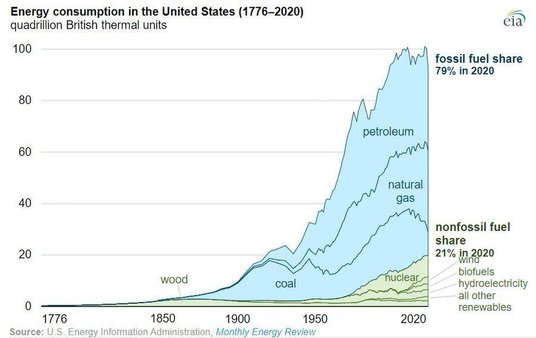 Zużycie energii pierwotnej wyniosło 93 biliardów brytyjskich jednostek cieplnych w Stanach Zjednoczonych w 2020 roku, czyli o 7 biliardów mniej niż w 2019 roku. (British thermal unit, Btu, BTU – jednostka energii stosowana przede wszystkim w Stanach Zjednoczonych, głównie przy określaniu energii generowanej przez urządzenia ciepłownicze. Jeden Btu to ilość energii potrzebna do podniesienia temperatury jednego funta wody o jeden stopień Fahrenheita.) Paliwa kopalne – ropa naftowa, gaz ziemny i węgiel – stanowiły 79 proc. całkowitego zużycia energii w USA w 2020 roku. Około 21 proc. zużycia energii w USA w 2020 r. pochodziło ze źródeł paliw niekopalnych, takich jak odnawialne źródła energii i energia jądrowa – najwyższy udział od początku XX wieku, zgodnie z danymi zawartymi w Monthly Energy Review, przygotowanym przez Energy Information Administration (EIA), publikującej oficjalne statystyki energetyczne rządu USA.