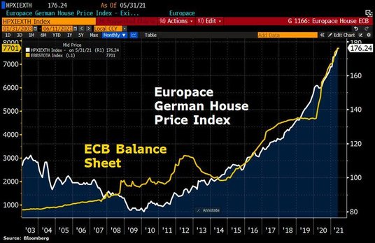 Indeks cen domów Europace wzrósł wraz z bilansem EBC do coraz to nowych rekordów. W maju skoczył o 1,8 proc. Indeks cen domów w Niemczech wzrósł od początku roku o 7 proc. Boom na domy w Niemczech nie słabnie, ponieważ gospodarka wychodzi z najgorszej w historii recesji spowodowanej pandemią koronawirusa. Średnia cena mieszkań wzrosła aż o 9,59 proc. w ciągu roku do I kw. 2021 r., po 11,42 proc. r/r w IV kw. 2020 r., 12,14 proc. w III kw., 10,85 proc. w II kw. i 12 proc. w I kw. W ujęciu kwartalnym ceny domów wzrosły o 2,09 proc. w I kwartale 2021 r. Rynek mieszkaniowy w Niemczech rozwijał się nieprzerwanie w ciągu ostatnich sześciu lat, a ceny domów wzrosły o prawie 67 proc. od pierwszego kwartału 2014 r. Popyt pozostaje silny, napędzany niskimi stopami procentowymi, urbanizacją i zdrowymi finansami gospodarstw domowych. W ostatnich latach kryzys migracyjny i silny wzrost gospodarczy przyczyniły się do i tak już silnego popytu w kraju.