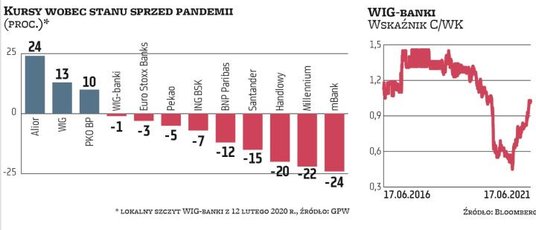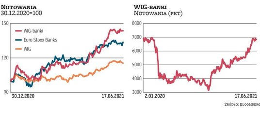 WIG-banki zyskał 43 proc. od początku roku, w samym maju prawie 18 proc., i zachowuje się ostatnio lepiej niż szeroki rynek oraz Euro Stoxx Banks. Dynamiczne zwyżki wycen banków na GPW wskazują, że inwestorzy liczą na dużą poprawę rentowności branży. Tę mogą umożliwić coraz bardziej realne podwyżki stóp.