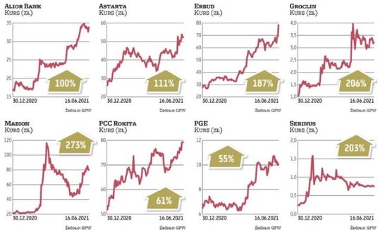 Zmiana nastawienia inwestorów do banków sprawiła, że mocno odbiły notowania indeksu WIG-banki. W tym gronie na szczególne względy inwestorów mógł liczyć Alior, co pozwoliło kursowi z zapasem odrobić straty z 2020 roku. – Wysoki wzrost notowań banku to skutek niezłych wyników. Tarcze dla firm oddaliły niebezpieczeństwo rezerw portfela korporacyjnego, bank nie posiadał kredytów frankowych, więc ominęły go problemy z tym związane. Obecnie bank jest notowany przy jednym z najniższych wskaźników w sektorze, przy dość dobrej dynamice (choć spadającej) wolumenów. Tym można tłumaczyć jego popularność wśród inwestorów – wyjaśnia Marcin Materna, szef analityków Millennium DM. Inwestorzy mocno liczą na poprawę tegorocznych rezultatów, czemu sprzyjać mają powrót gospodarki na ścieżkę wzrostu, spadek kosztów ryzyka i realizowane przez bank inicjatywy oszczędnościowe.