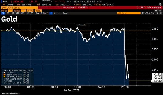 W czwartek złoto stabilizuje się w pobliżu sześciotygodniowego minimum, ponieważ inwestorzy rozważają wynik dwudniowego spotkania Fed, podczas którego bank centralny utrzymał docelowy zakres dla swojej referencyjnej stopy procentowej na niezmienionym poziomie do 0,25 proc., gdzie jest od marca 2020 r., oraz postanowił utrzymać tempo miesięcznych zakupów obligacji w wysokości 120 miliardów dolarów. Powell powiedział, że prognozy stóp procentowych „należy traktować z przymrużeniem oka" i ostrzegł, że dyskusje na temat podwyżek stóp będą „bardzo przedwczesne". - Złoto zdecydowanie ucierpiało na bardziej jastrzębich komentarzach pochodzących od Powella, ale wygląda na to, że rynek mógł nieco przesadzić, ponieważ inwestorzy kupują dziś dip – powiedział John Feeney, menedżer ds. rozwoju biznesu w firmie dealerskiej Guardian Gold Australia z siedzibą w Sydney. Jego zdaniem złoto czeka „wyboista jazda", ponieważ inwestorzy są niezdecydowani, „czy wyższa inflacja jest zwyżkowa, czy spadkowa dla cen metali szlachetnych, ponieważ mamy obawy związane z zaostrzeniem polityki Fed".