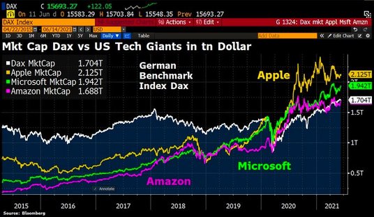 1,7 biliona dolarów – to łączna kapitalizacja 30 spółek wchodzących w skład Dax Blue Chips. To niewiele więcej niż kapitalizacja Amazona - 1,69 bln USD. Kapitalizacja Apple to ponad 2,1 bln USD, a Microsofta mocno przekracza 1,0 bln USD.