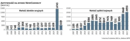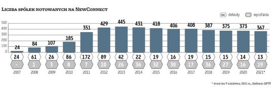 NewConnect wystartował 30 sierpnia 2007 r. Tego dnia zadebiutowało na nim pięć spółek. Obecnie jest ich niemal 370 o łącznej kapitalizacji sięgającej 21 mld zł. W 2019 r. była o ponad połowę niższa – co ciekawe, przy niemal takiej liczbie notowanych firm. Na rynku widać dużą rotację. W ciągu ostatnich dziesięciu lat w sumie wycofano 245 spółek, a zadebiutowało 509. Za ten imponujący bilans debiutów aż w ponad jednej trzeciej odpowiada rok 2011, kiedy to na parkiet weszły 172 spółki. W 2021 r. od stycznia mieliśmy 13 debiutów.