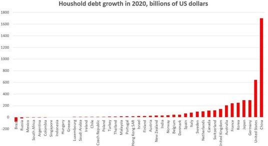 Jednak niektóre kategorie zadłużenia odnotowują zapierający dech wzrost. Na przykład South China Morning Post donosi, że zadłużenie konsumenckie doświadczyło i obecnie jest „jednym z najszybciej rosnących segmentów całkowitego zadłużenia, szczególnie w postaci kredytów hipotecznych i konsumenckich". Zadłużenie gospodarstw domowych gwałtownie rosło od czasu kryzysu finansowego z 2008 r., ponad dwukrotnie, do około 60 proc. PKB. Chociaż jest to również dość niskie według standardów międzynarodowych, jest to oczywiste dla gospodarki, która próbuje przejść z eksportu na konsumpcję krajową.