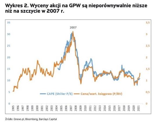My jesteśmy jednak dalecy od przekładania owego nieszczęśliwego epizodu na ogólne rozważania dotyczące istoty długoterminowego inwestowania. Aby zdać sobie sprawę z powodu, dla którego szczyt z 2007 r. odcisnął takie piętno na wieloletnich stopach zwrotu i stał się niechlubnym symbolem w historii GPW, musimy przyjrzeć się wycenom akcji rodzimych spółek.