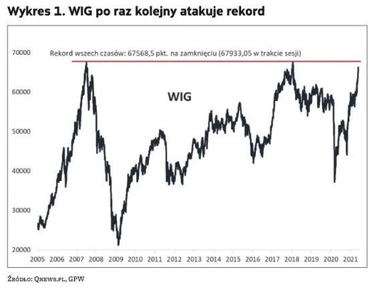Jakże dynamicznie potrafi się zmieniać sytuacja na rynku akcji! Podczas gdy jeszcze 14 miesięcy temu rodzimy WIG przeżywał kulminacyjną fazę załamania trwającego z przerwami od 2018 r., to obecnie jest o krok od odrobienia wszystkich tych strat. Indeks znalazł się zarazem w bezpośrednim sąsiedztwie rekordu wszech czasów z połowy 2007 r., którego nie udało się pokonać właśnie na początku 2018 r.