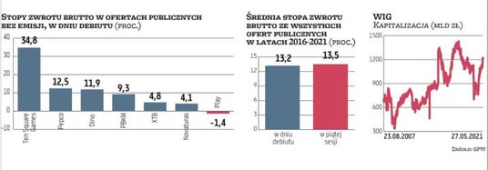 Takie oferty także dały zarobić. PBKM i XTB, które zadebiutowały wiosną 2016 r., na pierwszej sesji przyniosły odpowiednio 9 proc. i blisko 5 proc. zysku (brutto). Stopa zwrotu na piątej była podobna. Do teraz cena akcji PBKM jest o blisko 100 proc., a XTB o prawie 60 proc. wyższa niż w ofercie. Play w lipcu 2017 r. stracił na pierwszej sesji 1,4 proc., ale po pięciu sesjach był 2,5 proc. na plusie (spółka kilka tygodni temu została wycofana z obrotu po wezwaniu po cenie o 10 proc. wyższej niż w IPO). Gorzej było z Novaturasem, który wprawdzie w marcu 2018 r. na pierwszej sesji przyniósł 4-proc. zysk, ale teraz kurs jest o połowę niższy niż w ofercie. Świetnie wypadło Dino, które w kwietniu 2017 r. na pierwszej sesji przyniosło 12 proc. zysku, a na piątek 17 proc., co było dobrym prognostykiem, bo teraz cena akcji jest o 660 proc. wyższa niż w IPO. Najlepiej poradził sobie Ten Square Games, który zyskał na pierwszej sesji w maju 2018 r. aż 35 proc., a kurs teraz jest o 840 proc. wyższy niż cena z IPO.