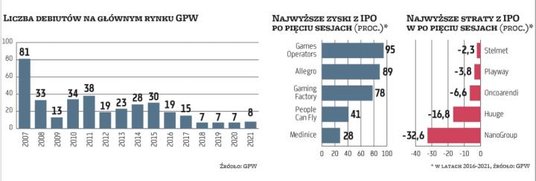 Były także oferty „mieszane", tzn. takie, w których sprzedawano zarówno istniejące akcje, jak i emitowano kolejną serię. Proporcje wartości nowych walorów do łącznej wartości oferty były różne, ale pod uwagę wzięliśmy takie, w których udział nowych walorów w wartości oferty wynosił nie więcej niż 50 proc. Tego typu transakcji w latach 2016–2021 było dziewięć, łącznie opiewały na 12,7 mld zł, z czego nowe papiery stanowiły 2,26 mld zł (czyli średnio 13 proc.). W tej grupie średnia stopa zwrotu na debiucie (wyłączając producentów gier, którzy mocno podbijają tę statystykę) wyniosła +7 proc., ale różnice między emitentami były spore – od -4 proc. do +60 proc. Trudno zatem o regułę. W przypadku spółek, w których emisje stanowiły co najmniej 50 proc. wartości oferty, średnia stopa zwrotu w debiutanckiej sesji również wynosiła 7 proc. (w przedziale -5 proc. do +30 proc.). Wygląda na to, że większe znaczenie dla wyniku w krótkim terminie mają nastroje rynkowe i pozostałe cechy samej spółki i oferty niż fakt, czy sprzedawane są tylko istniejące akcje, czy także nowo emitowane.