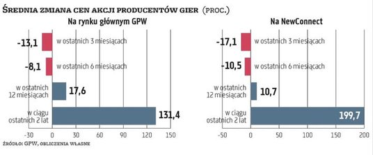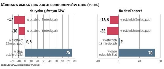 WIG.GAMES obejmuje tylko pięć spółek i nie pokazuje szerokiego obrazu sektora. Jednak daje się zauważyć wyraźną korelację między stopami zwrotu z tego wskaźnika a zachowaniem się mniejszych firm, które „podpinają" się pod branżowe nastroje wyznaczane przez największe studia. Przeanalizowaliśmy stopy zwrotu wszystkich 61 studiów notowanych na GPW i NC. W przypadku tego sektora (mocne wahania kursów, dużo wartości skrajnych) bardziej miarodajnym wskaźnikiem niż średnia jest mediana. Obliczyliśmy ją dla okresu za 3 miesiące, 6 miesięcy, 12 miesięcy i za 24 miesiące. Dla rynku głównego otrzymujemy odpowiednio: -17 proc., -10 proc., prawie 1 proc. i 75 proc. Dla spółek notowanych na NewConnect odpowiednio: prawie -17 proc., -22 proc., 2 proc. i 70 proc. W przypadku średniej zmiana cen za ostatnie dwa lata prezentuje się bardziej okazale: dla NC wynosi niemal 200 proc., a dla rynku głównego 131 proc.