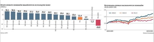 Od początku roku WIG zyskał 11,4 proc., ale niektóre indeksy sektorowe, jak np. energetyczny, motoryzacyjny, lekowy czy bankowy, po 30 proc., a nawet więcej (stopy zwrotu na wykresie powyżej).
