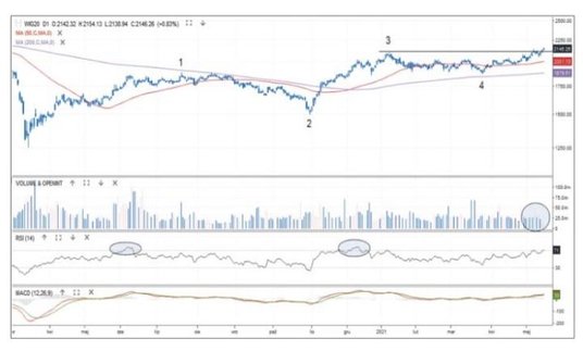 Z punktu widzenia analizy technicznej nowy szczyt to klasyczny sygnał kontynuacji hossy. Licząc od początku roku do wtorkowego maksimum, WIG20 jest już 8,6 proc. na plusie. Skala wzrostu od listopadowego dołka sięga 43,9 proc., a od dołka z marca 2020 r. 72 proc. Jeśli patrzeć na wykres w ujęciu rocznym z perspektywy teorii fal Elliotta, to można uznać, że przebijając styczniowy szczyt, WIG20 rozpoczął piątą falę, w pięciofalowym układzie. Jest to fala impulsu, która powinna zakończyć cykl hossy. Szkopuł w tym, że choć faktycznie mamy teraz kolejną falę impulsu, to długości fal wyraźnie odbiegają od legendarnej koncepcji. Mowa przede wszystkim o tym, że fala trzecia trwała zaledwie dwa miesiące i była krótsza od pierwszej. Tymczasem zgodnie z teoretycznym ujęciem powinna być najdłuższa.