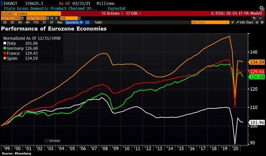 Słaby początek roku w największej gospodarce Europy stał w wyraźnym kontraście z 0,5-proc. wzrostem produktu krajowego brutto) odnotowanym w czwartym kwartale 2020 r., zanim bardziej zaraźliwe warianty wirusa odwróciły odbicie Niemiec. Wyniki Niemiec były również gorsze niż dane innych dużych europejskich gospodarek. Francja ogłosiła powrót do wzrostu w okresie od stycznia do marca na poziomie 0,4 proc. Od 1999 r. gospodarka tego kraju wzrosła o ponad 29 proc. Wspomniane Włochy odnotowały spadek o 0,4 proc., a Hiszpania spadła o 0,5 proc. Jednak od 1999 r. gospodarka iberyjska wzrosła aż o 34,6 proc.