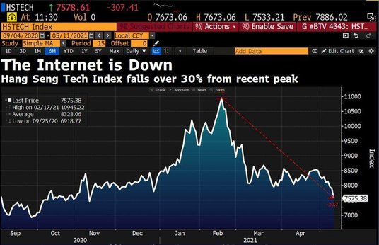 Światowy spadek cen akcji spółek technologicznych pogłębił się we wtorek (11 maja), a niepokój inwestorów wywołany inflacją i napięte wyceny potęgowały nowe oznaki kontroli regulacyjnej w Chinach.