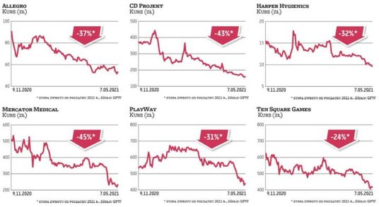 Pandemia Covid-19 okazała się szansą na przyspieszenie wzrostu biznesu niektórych spółek z warszawskiej giełdy, co zrodziło wobec nich duże oczekiwania, które mocno wywindowały ceny ich akcji. Tak było w przypadku Mercatora, który skorzystał z wysokiego zapotrzebowania na środki ochrony osobistej, wypracowując ogromne zyski (w 2020 r. spółka miała 935 mln zł zysku netto!). Pandemiczne otoczenie nadal wspiera biznes Mercatora, ale do inwestorów najwyraźniej dotarło już, że okres łatwych zysków powoli się kończy. Zdaniem analityków oczekiwany dalszy spadek cen rynkowych rękawic w połączeniu z wyższymi kosztami będzie miał negatywne przełożenie na zyski producenta, co już było widoczne w wynikach I kwartału br. (wyraźny spadek względem rekordowego IV kwartału 2020 r.).
