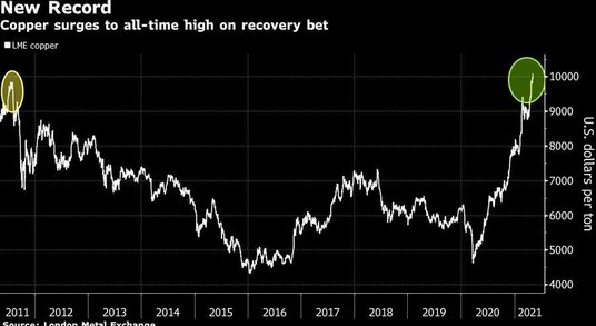 Wzrost na rynkach towarowych nabrał tempa w ostatnich tygodniach, podsycając oczekiwania niektórych traderów i analityków, że „supercykl" rozpoczął się, gdy ożywiły się wielkie globalne gospodarki. Silny popyt ze strony Chin, wzrost wydatków rządowych na programy naprawy po pandemii oraz zakłady na „zazielenianie" światowej gospodarki podniosły ceny wielu ważnych surowców. Ruda żelaza, pallad, używany przez producentów samochodów do ograniczania szkodliwych emisji oraz drewno osiągnęły rekordowe wartości. Skoczyły również ceny kluczowych towarów rolnych, w tym zbóż, nasion oleistych, cukru i nabiału, a cena kukurydzy po raz pierwszy od ośmiu lat przekroczyła 7 dolarów za buszel.