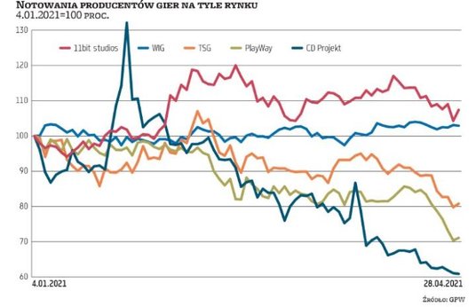 WIG.GAMES jest najniżej od 12 miesięcy. W samym 2021 r. z indeksem WIG przegrywa o 24 pkt proc. Z kolei od maksimum zanotowanego w zeszłym roku indeks producentów gier stracił 34 proc. W jego skład wchodzi 5 spółek: CD Projekt (34,3-proc. udział w portfelu), Ten Square Games (32,9 proc.), 11 bit studios (19,8 proc.), PlayWay (9,9 proc.) oraz CI Games (3,1 proc.).