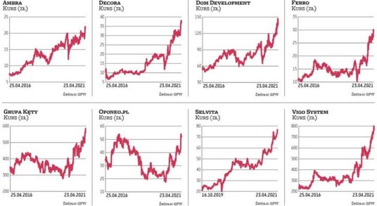 Mimo zmiennej koniunktury na warszawskiej giełdzie nie brakuje spółek, których notowania ustanawiają nowe rekordy cenowe. W trzech najważniejszych indeksach GPW w samym tylko kwietniu notowania 15 emitentów wspięły się na nowe szczyty (biorąc pod uwagę takie firmy, które mają przynajmniej pięcioletni okres obecności na parkiecie). Większość z nich może się pochwalić kilkuletnim trendem wzrostowym, choć niemal wszystkie musiały zmierzyć się po drodze z mniejszą lub większą korektą, spowodowaną pandemicznym tąpnięciem z wiosny 2020 r. Straty nią wywołane udało się im jednak stosunkowo szybko odrobić, co zawdzięczają inwestorom wciąż pokładającym w nich duże nadzieje.