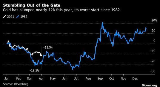 Złoto odnotowało swój najgorszy początek roku od 1982 r., a inwestorzy unikają bezpiecznej przystani, ponieważ znajduje się pod presją rosnących rentowności obligacji i umacniającego się dolara. Żółty metal spadł w tym kwartale o ponad 10 proc., ponieważ inwestorzy wymieniają je na aktywa, które korzystają na ożywieniu gospodarczym. Od początku roku spadek sięga 11,5 proc. Zasoby funduszy notowanych na giełdzie spadły do ??najniższego poziomu od maja, podczas gdy fundusze hedgingowe na Comex obniżyły swoje pozycje do prawie dwuletniego minimum. Kruszec odrobił część swoich miesięcznych spadków w środę, gdy dolar tracił na wartości.