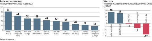 Spośród głównych indeksów giełdowych najmocniej zyskał od 9 marca 2020 r. HNX, czyli indeks giełdy w Hanoi. Wzrósł on aż o 157 proc. Zadziwiał wzrostem rosyjski MOEX, który poszedł w górę aż o 83 proc. Mocno się wyróżniał również mongolski indeks MSE Top 20, który zyskał w tym czasie 78 proc. Spośród indeksów rynków rozwiniętych liderami były: japoński indeks wschodzących spółek TSE Mothers (+81 proc.) i amerykańskie indeksy małych spółek – S&P 600 Small Cap (+75 proc.) i Russell 2000 (+74 proc.). Nasdaq Composite wzrósł w tym okresie o 64 proc. Prawie o tyle samo poprawił się polski sWIG80. Bardzo dobrze radziły sobie również m.in.: argentyński Merval (+56 proc.), koreański KOSPI (+52 proc.), turecki BIST 100 (+52 proc.), japoński Nikkei 225 (+48 proc.), tajwański Taiex (+47 proc.) czy indyjski Sensex (+ 44 proc.). Nasz WIG ze wzrostem wynoszącym 31 proc. radził sobie bardzo podobnie jak brazylijski indeks Bovespa czy włoski FTSE MIB, a WIG20 (+24 proc.) urósł bardziej niż chiński Shanghai Composite (+18 proc.) lub węgierski BUX (+15 proc.). Ogółem inwestorzy mogli przez ostatnie 12 miesięcy przyzwoicie zarabiać zarówno na rozwiniętych rynkach akcji, jak i na wschodzących. Niewiele indeksów jest obecnie niżej niż 12 miesięcy temu. Najgorszym z nich okazał się główny indeks giełdy na Mauritiusie, który stracił 17 proc.