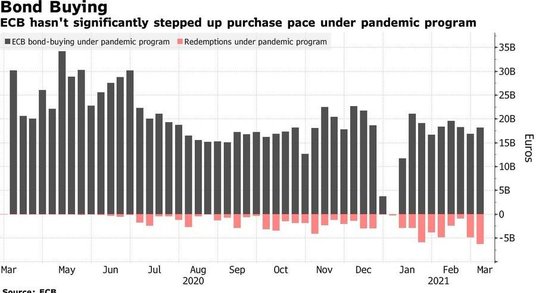 Podczas gdy większość ekonomistów ankietowanych przez Bloomberga twierdzi, że bank centralny ostatecznie przedłuży swój program zakupu obligacji pandemicznych o wartości 1,85 bln euro poza obecną datę końcową marca 2022 r., to decyzja ta wydaje się mało prawdopodobna na tym posiedzeniu. Nie oczekuje się żadnej zmiany stopy depozytowej -0,5 proc. ani niczego poza technicznymi poprawkami w programie pożyczek długoterminowych. Zamiast tego nacisk zostanie położony na słowa. Inwestorzy szukają jakiejkolwiek wskazówki, że EBC planuje zastosować tak szeroko reklamowaną elastyczność swojego programu obligacji, aby ograniczyć rentowności.