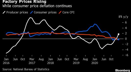 Jako że Chiny są producentem dla całego świata, rosnące ceny producentów zwiększają perspektywę rozpoczęcia globalnego eksportu inflacji, ponieważ fabryki podnoszą ceny towarów sprzedawanych za granicą. Rynki obligacji już odczuły oczekiwania, że ??szybszy światowy wzrost i potężne bodźce fiskalne w USA spowodują wzrost inflacji. Chińskie ceny producentów były głównym czynnikiem przyczyniającym się do globalnej inflacji w ostatnich dziesięcioleciach, gdy łańcuchy dostaw stały się bardziej zintegrowane. Spadek cen był głównym czynnikiem powodującym dezinflację w latach 2012-2016 i utrudnił bankom centralnym w innych krajach osiągnięcie celów trwałej inflacji. Tym razem zagrożenia inflacyjne idą w innym kierunku. Ceny ropy wzrosły do blisko 70 dolarów za baryłkę, wzrosły też ceny miedzi i produktów rolnych. Zwiększyły się ceny wysyłki wzrosły, kolejny wzrost cen może spowodować globalny niedobór chipów komputerowych.