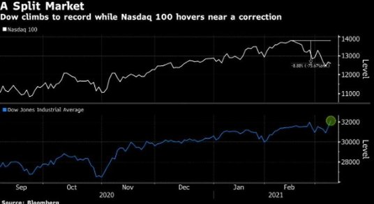Jednym z najlepszych przejawów odejścia od wcześniej szybko notujących wzrostów akcji do walorów spółek wartościowych jest rozbieżność między indeksem Nasdaq 100 a Dow Jones Industrial Average. Gdy 125-letni benchmark wzrósł do kolejnego rekordu w ciągu dnia, Nasdaq 100 spadł do poziomu tradycyjnie postrzeganego jako korekta - podkreśla Bloomberg. Po raz pierwszy od 1993 r. Dow wzrósł i zamknął się w granicach 1-proc. rekordu, podczas gdy wskaźnik zaawansowania technologicznego spadł o ponad 10 proc. od swojego najwyższego poziomu.