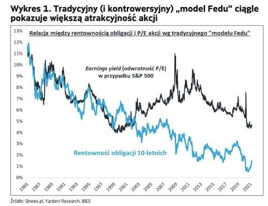 Teoretycznie najbardziej poprawnym metodologicznie podejściem do oceny relatywnej atrakcyjności akcji jest wycena zdyskontowanych przyszłych strumieni pieniężnych. Bez względu na to, jak dokładnie wygląda taki model wyceny, zawsze jednym z podstawowych elementów do kalkulacji jest „stopa wolna od ryzyka", czyli właśnie rentowność obligacji. Logika takiego modelu jest jednoznaczna – im wyższa ta stopa, tym (przy innych założeniach niezmienionych) wyliczona wartość fundamentalna jest niższa.