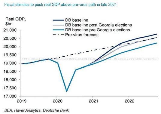 Pomimo tego, że rok 2020 był zły, przygotował naród na to, co według ekonomistów będzie bardzo silnym odbiciem. Wielu prognozuje stopę wzrostu na poziomie 5 proc. lub więcej w bieżącym kwartale, przy czym w niektórych prognozach mówi się nawet o wzroście o 9 proc. Ekonomiści prognozują, że przez cały 2021 rok PKB może wzrosnąć o 6 proc.. Byłby to najszybszy roczny wzrost PKB od czasu wzrostu gospodarczego o 7,2 proc. w 1984 r., kiedy prezydentem był Ronald Reagan. Zwiększaniem optymizmu co do powrotu gospodarczego jest gwałtowny spadek liczby nowych infekcji Covid-19 i niedawny wzrost sprzedaży w zagrożonym sektorze detalicznym. „Jest ogromny rządowy bodziec, niskie stopy procentowe ze strony Fed, a podaż szczepionek rośnie" - powiedział Sung Won Sohn, profesor finansów i ekonomii na Uniwersytecie Loyola Marymount w Los Angeles. „Gospodarka zaczyna pracować na wszystkich cylindrach".
