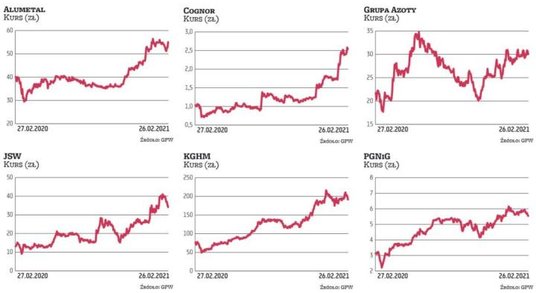 Wpływ cen surowców na działalność biznesową spółek bywa na tyle znaczący, że wyznacza kierunek notowań ich akcji. Wysoka korelacja z rynkiem surowców występuje w spółkach wydobywczych. W 2020 r. mocne odbicie cen pociągnęło w górę notowania spółek z tego sektora. – Spośród polskich spółek surowcowych najmniejsza historyczna korelacja cen akcji spółki i notowań surowca bazowego miała miejsce w przypadku Bogdanki. Dzieje się tak ze względu na długoterminowy charakter umów na dostawę węgla, zawieranych z krajowymi elektrowniami. W przypadku JSW, korelacja notowań akcji i węgla koksowego jest znacząco wyższa, bowiem specyfika tego rynku jest oparta na cenach benchmarkowych tego surowca opartych na kwartalnych, średnich notowaniach spot. Największa korelacja, zwłaszcza obecnie, gdy ceny metali bazowych są dużo wyższe od kosztu wytworzenia, występuję na cenie akcji KGHM oraz miksie cen miedzi i srebra ważonych wydobyciem – wskazuje Krzysztof Kozieł, analityk BM Pekao.