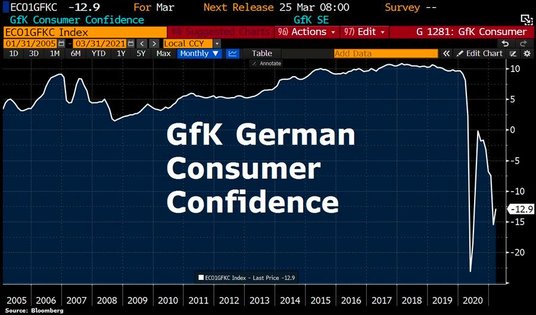 Nastroje niemieckich konsumentów poprawiły się bardziej, niż oczekiwano, gdyż kupujący w największej gospodarce Europy stali się bardziej optymistyczni w kwestii możliwego złagodzenia blokad mających na celu powstrzymanie pandemii COVID-19. Indeks nastrojów konsumentów GfK poprawił się do -12,9 pkt z -15,5 pkt po rewizji lutych danych i przekroczył prognozę Reutera poprawy do -14,3. To pierwszy miesięczny wzrost od października.