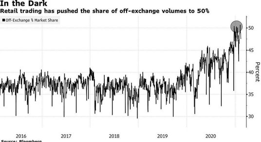 Przez lata obrót pozagiełdowy stanowił zwykle od 30 do 40 proc. całkowitego wolumenu akcji w USA. Na początku ostatniej dekady większość obaw krytyków skupiała się na tym, jak ciemne pule - rynki prywatne zwykle zarządzane przez banki, które chcą utrzymywać zamówienia swoich klientów we własnym zakresie - przejmują biznes z NYSE i Nasdaq. Jednak ruch do ponad 50 proc. rozpoczął się około rok temu we wczesnych stadiach pandemii, napędzany eksplozją handlu detalicznego. „Należy zadać pytanie: czy rynek nadal uzyskuje prawidłowe ceny, gdy występuje podwyższony poziom aktywności pozagiełdowej?" pyta Justin Schack, partner w Rosenblatt Securities w Nowym Jorku. „Jeśli sprzedajesz swój dom, chcesz pokazać go jak największej liczbie osób, a nie tylko jednej lub dwóch". Przedstawiciel Citadel Securities odmówił komentarza. Dyrektor firmy Virtu odrzucił pogląd, że transakcje obsługiwane przez jego firmę i jej konkurentów odbywają się w tajemnicy.