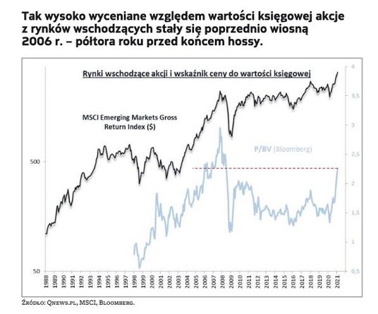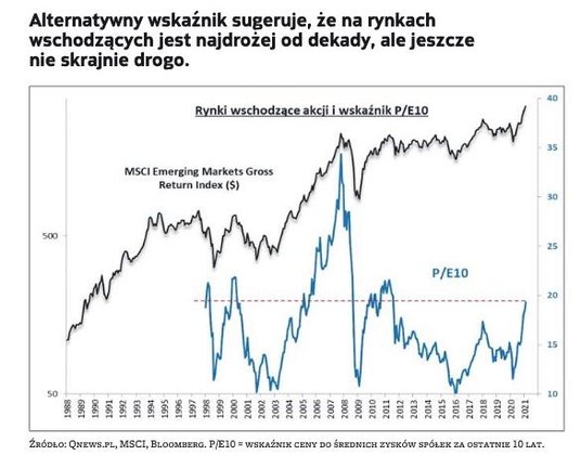 Innymi słowy, nowych rekordów na rynkach wschodzących nie należy traktować automatycznie w kategoriach anomalii lub bańki spekulacyjnej. Taka diagnoza byłaby uzasadniona, gdyby akcje na emerging markets stały się ekstremalnie drogie według obiektywnych miar, tak jak to było w latach 2006–2007.