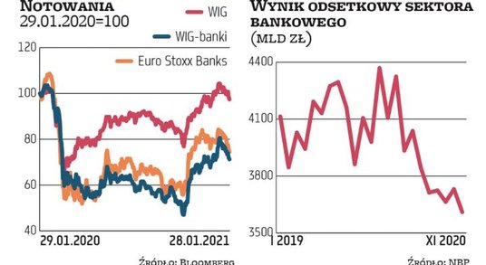 Podobnie przecenione zostały w tym czasie także banki europejskie, ale polskim kredytodawcom zaszkodzić mogły dodatkowo komentarze płynące z Narodowego Banku Polskiego. Adam Glapiński, prezes tej instytucji, stwierdził, że dopuszcza ujemne stopy procentowe w Polsce. Dodał, że gdyby perspektywy koniunktury się pogorszyły, może się pojawić potrzeba obniżenia stóp. – Mamy dużą przestrzeń i nie zawahamy się, ale najbardziej prawdopodobny scenariusz nie zakłada takiej potrzeby – stwierdził Glapiński. Wśród ekonomistów dominuje pogląd, że niskie stopy pozostaną w Polsce na dłużej, co dla banków oznacza nadal niskie marże odsetkowe, więc nie ma co liczyć na dynamiczne odbicie wyniku z odsetek (ubytek tego rezultatu w 2020 r. z powodu niższych stóp to ok. 4,8 mld zł). W całym 2020 r. wynik odsetek sektora spadł o 5 proc., do – jak wynika z szacunków – 43,2 mld zł. MR
