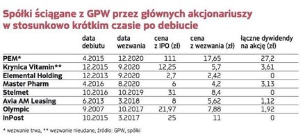 Kurierski InPost zadebiutował na GPW w październiku 2015 r. i w IPO sprzedawano akcje po 25 zł za sztukę, wartość oferty wyniosła 121 mln zł (nie było emisji, pieniądze ze sprzedaży istniejących akcji trafiły do spółki matki, czyli do Integera). W sierpniu 2016 r., niecały rok po debiucie, za akcje InPostu płacono już poniżej 6,8 zł. Po przeprowadzonym wiosną 2017 r. wezwaniu główny akcjonariusz wycofał spółkę z GPW, płacąc zaledwie po 11 zł za walor, czyli strata inwestorów z GPW, zanotowana przez półtora roku, wyniosła aż 56 proc.
