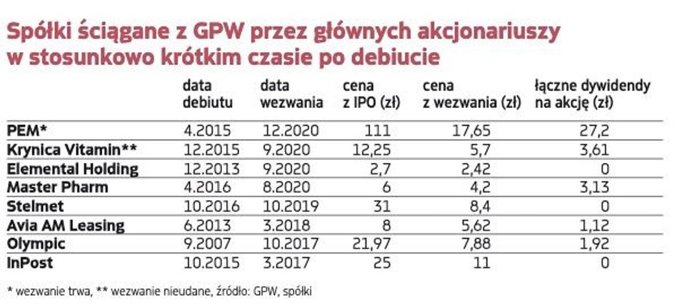 Wspomniane przypadki skończyły się wycofaniem spółek z GPW. Były jednak także takie przypadki, gdy głównym akcjonariuszom delisting się nie udał. Jednym z najświeższych i najciekawszych takich przypadków jest Krynica Vitamin, producent suplementów diety, który zadebiutował na głównym rynku pod koniec 2015 r. Oferta była warta 26 mln zł, z czego prawie 20 mln zł to środki pozyskane z emisji. Akcje sprzedawano po 12,25 zł, ale latem 2020 r. główny akcjonariusz ogłosił wezwanie po 5,7 zł za walor (w międzyczasie łączne dywidendy wyniosły 3,61 zł na walor), czyli z niewielką premią wobec bieżących notowań. Celem było wycofanie spółki z obrotu, jednak żadnych zapisów inwestorzy nie złożyli. Chwilę później spółka pochwaliła się wyjątkowo dobrymi wynikami i kurs wystrzelił: w kilkanaście sesji dotarł w okolice aż 35 zł, obecnie sięga 22 zł.