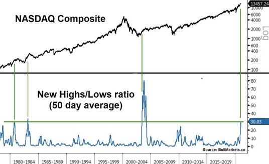 50-dniowy wskaźnik nowych maksimów/minimów NASDAQ wzrósł do najwyższego poziomu od 2004 roku.