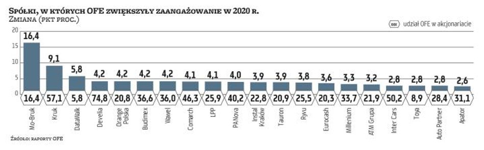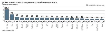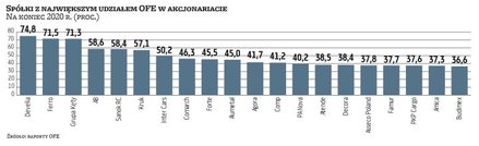 Największą wartość w portfelu OFE miał pakiet akcji największych spółek z indeksu WIG20. Była to kwota wynosząca prawie 70 mld zł. Nie powinno to specjalnie dziwić, biorąc pod uwagę fakt, że stanowiły one 60,8 proc. portfela krajowych akcji posiadanych przez OFE. Papiery „średniaków" z indeksu mWIG40 były warte łącznie 30,4 mld zł i odpowiadały za prawie 26,6 proc. portfela. Pakiet walorów małych spółek z sWIG80 w portfelach funduszy stanowił 7,7 proc., co przekłada się na wartość ok. 8,8 mld zł. W porównaniu z danymi sprzed roku widać lekki wzrost zainteresowania zarządzających mniejszymi spółkami kosztem tych największych. W skali całego 2020 r. udział spółek z WIG20 w portfelu krajowych akcji będących w rękach OFE zmniejszył się o 1,2 pkt proc., podczas gdy pakiety akcji małych spółek miały odpowiednio o 0,7 pkt proc. więcej niż przed rokiem. Zmniejszyło się nieco znaczenie spółek o średniej kapitalizacji z indeksu mWIG40, których udział w portfelach funduszy skurczył się do 26,6 proc. z 27 proc. rok wcześniej.