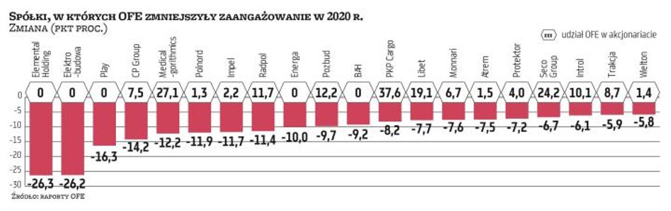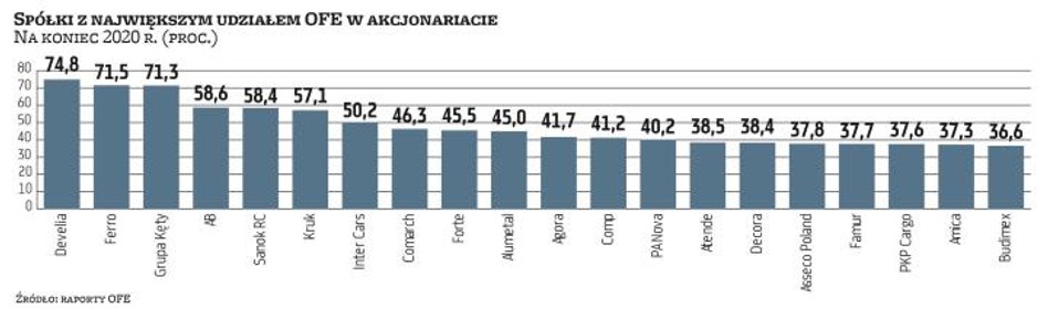 Na koniec 2020 roku wszystkie OFE posiadały akcje o łącznej wartości przekraczającej 126,5 mld zł. Z tego prawie 115 mld zł stanowiły akcje spółek notowanych na warszawskiej giełdzie, co oznacza, że stanowiły ponad 90 proc. ich portfeli.