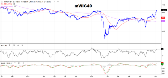 Na przedpandemiczne poziomy wrócił w czwartek indeks średnich spółek. MWIG40 rósł po południu nawet do 4158 pkt. To najwyższy pułap od maja 2019 r. W poprzednich latach pułap 4150 pkt był dwukrotonie silną barierą techniczną, więc niewykluczone, że i tym razem zainicjuje korekcyjny spadek. Zwłaszcza, że RSI(14) jest już w strefie wykupienia, a MACD na pułapach najwyższych od kilku lat. Przebity na początku roku, okrągły poziome 4000 pkt stanowi teraz najbliższe wsparcie. Z kolei opór i jednocześnie potencjalny zasięg obecnej fali wzrostowej wyznaczają lokalne szczyt z marca i kwietnia 2109 r., zlokalizowane przy 4300 pkt.