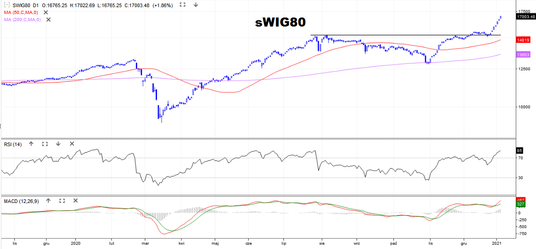 Ósmą sesję z rzędu rósł dziś sWIG80. Po południu indeks dotarł w porywach do 17 022 pkt. To najwyższy poziom od 2007 r. Maluchom sprzyja efekt stycznia i dominujący na wykresie trend, potwierdzony zwyżkującymi średnimi z 50 i 200 sesji. Skala zwyżek jest już jednak tak wysoka, że RSI(14) dotarł do 85 pkt. Tymczasem za granicę wykupienia przyjmuje się 70 pkt. Mamy więc skrajne wykupienie, podobne do tego z końca lipca 2020 r. Wtedy doszło do korekty, więc niewykluczone, że historia się powtórzy. Silne wsparcie, wyznaczone przez poprzedni szczyt i wzmocnione średnią z 50 sesji, znajduje się przy 15 200 pkt. Co do potencjalnych zasięgów zwyżek w szerszym horyzoncie czasowym – długoterminowe opory wskazują, że celem może być najpierw okolica 19 000 pkt, a później historyczne rekordy powyżej 20 000 pkt.