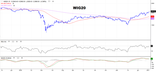 WIG20 rósł w czwartkowe popołudnie o 2,8 proc. do 2066 pkt. To najwyższy poziom od 24 lutego. Nowy szczyt trendu wzrostowego, zgodnie z klasyką AT, to sygnał jego kontynuacji. W tym kontekście zasadne jest oczekiwanie, że indeks wróci w średnim terminie na poziomy sprzed pandemii, czyli co najmniej do strefy 2100-2200 pkt. Taki scenariusz wspiera złoty krzyż utworzony w grudniu przez średnie kroczące z 50 i 200 sesji, a także zawracający w górę MACD. Ponadto RSI(14) jeszcze nie przebił granicy 70 pkt, a do lokalnych szczytów jeszcze trochę mu brakuje. W tym kontekście i krótki termin wygląda optymistycznie. Biorąc jednak skalę zwyżek od początku listopada – z 1500 pkt na 2066 pkt – należy liczyć się z możliwością retestu okrągłych 2000 pkt.