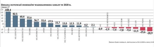 Pandemia rozdawała karty nierówno, nie zawsze zgodnie z intuicją, co widać po stopach zwrotu z indeksów branżowych. WIG-górnictwo, pchany przez KGHM, jest zwycięzcą tego rankingu z ponad 80-proc. dorobkiem. Za nim uplasowały się budownictwo i gaming. Ten ostatni miałby znacznie lepszy wynik, gdyby nie turbulencje CD Projektu po premierze „Cyberpunka". Chyba nie będzie przesadą stwierdzenie, że obok czarnego łabędzia w postaci Covid-19 i debiutu Allegro, grudniowe załamanie kursu akcji CDR było najbardziej emocjonującym wydarzeniem 2020 r.