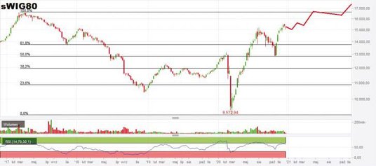 Rok 2020 na warszawskim rynku akcji kończymy w całkiem dobrych nastrojach. Od listopada na naszym rynku dominuje popyt, a główne indeksy poprawiają lokalne maksima covidowej hossy. Na rynku nie brakuje ani zmienności, ani obrotów, a analitycy techniczni dostrzegają na wykresach powody do optymizmu. Wybicie z formacji chorągiewki, korzystny układ zniesień Fibonacciego, analiza historycznych notowań i opuszczenie formacji podwójnego dna, wejście w drugą falę hossy i przebicie w górę linii trendu spadkowego – to akcentowane przez nich sygnały. Szczegółowe opisy poszczególnych sygnałów oraz wskazania potencjalnych zasięgów, wsparć i oporów znajdują się obok. My wybraliśmy wartości skrajne poziomów docelowych, by w odniesieniu do obecnych pułapów cenowych (stan na 23 grudnia godz. 12) nakreślić najbardziej optymistyczny i najbardziej pesymistyczny scenariusz dla każdego indeksu. Owe zasięgi porównujemy też z miesięcznymi danymi historycznymi, które pozwoliły wyznaczyć hipotetyczną statystyczną ścieżkę przyszłych zmian dla każdego wskaźnika.