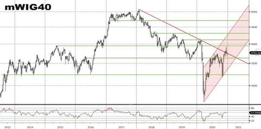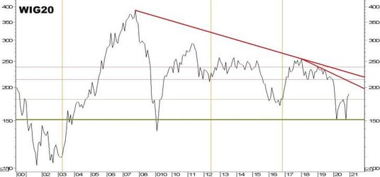 Zacznijmy od NewConnect. W byczym scenariuszu prof. Krzysztofa Borowskiego NCIndex realizuje wybicie z chorągiewki/flagi i rośnie w 2021 r. aż o 100 proc., do 950 pkt. Kto nie wierzy w taki potencjał, niech zerknie na jego wykres w ujęciu rocznym. Okazuje się, że dorobek mijającego roku to dokładnie podwojenie wartości indeksu. Niestety, w wariancie pesymistycznym indeks spada o 80 proc. i melduje się przy 190 pkt, a więc przy poziomie, od którego nie mógł się oddalić w roku ubiegłym.