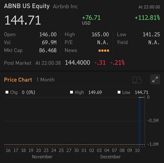 Airbnb otworzył się po 146 USD za akcję w pierwszym dniu handlu w czwartek, co oznaczało ponad dwukrotny wzrost ceny 68 USD za akcję ustalonej w dniu wcześniejszym podczas pierwszej oferty publicznej. Akcje zakończyły dzień wzrostem o ponad 112% w czwartkowym debiucie IPO, najnowszej spółki technologicznej, która pokazała ogromne zyski w pierwszym dniu handlu w tym roku.