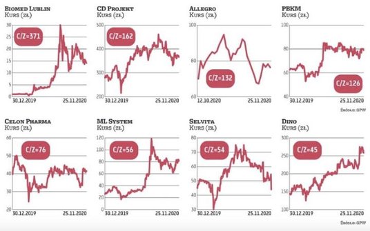 W przypadku części spółek, dla których okres pandemii miał szansą na skokowy wzrost zysków, może być trudno o uzasadnienie obecnych, wysokich wskaźników wyceny. Najlepszym przykładem jest Biomed-Lublin, będący jednym z najdroższych emitentów, jeśli weźmiemy pod uwagę wskaźnik C/Z. – Biomed należy do grona spółek, które znacznie urosły przez spekulacje związaną z potencjalnym skokowym wzrostem wyników przez Covid-19. Problem w tym, że dotychczasowe wyniki w tym roku tych ogromnych oczekiwań w ogóle nie potwierdzają. Jednocześnie badania kliniczne nad lekiem przeciwko Covid-19 na bazie osocza ozdrowieńców nawet się jeszcze nie rozpoczęły, podczas gdy szczepionka BioNTech/Pfizer, które mają dostęp do wiele większych środków finansowych, prawdopodobnie otrzyma zezwolenie na sprzedaż jeszcze w grudniu tego roku. Biorąc to pod uwagę oraz fakt, ze insiderzy spółki sprzedawali znaczne pakiety akcji w II i III kwartale br., uważam, że inwestycja w Biomed-Lublin jest obecnie obarczona bardzo dużym ryzykiem – wskazuje Adrian Kowolik, analityk East Value Research.