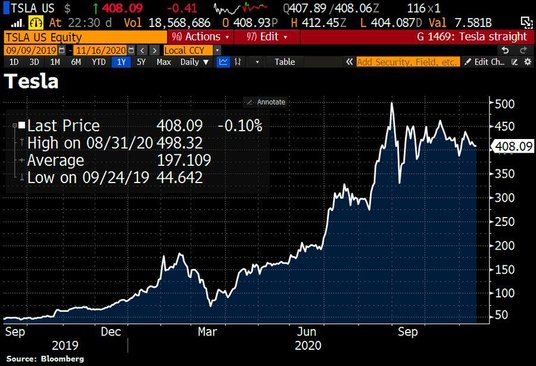 Odbicie pod koniec poniedziałkowej sesji podniosło wartość giełdową Tesli o ponad 50 miliardów dolarów i po intensywnym wzroście odrobiło 8 procent do rekordu z sierpnia.