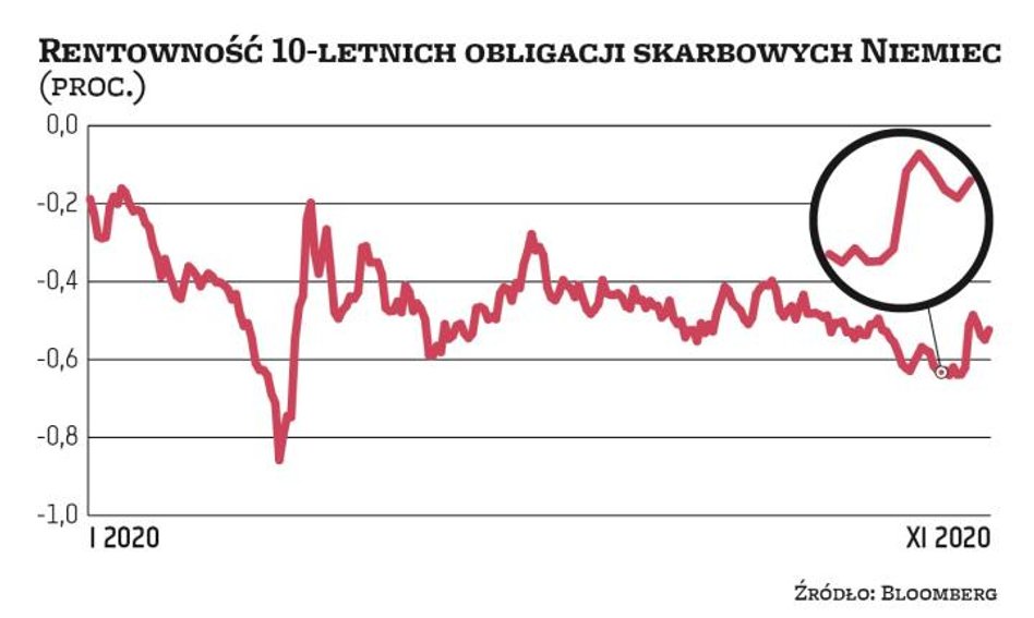 Także zdaniem ekonomistów z banku Berenberg dalszy istotny wzrost rentowności obligacji nie będzie możliwy dopóty, dopóki świat zmaga się z drugą falą pandemii. Według nich w przyszłym roku, który będzie początkiem kilkuletniego okresu błyskawicznego wzrostu gospodarczego na świecie, dochodowość obligacji skarbowych na tzw. rynkach bazowych (USA, Niemcy, Francja, W. Brytania) może wzrosnąć o około 0,6 pkt proc. Byłoby to wprawdzie ekwiwalentem zaostrzenia polityki pieniężnej, ale nie na taką skalę, aby zablokować odbudowę gospodarek po pandemii. „Przecena obligacji w dużym stopniu oznacza sukces polityki pieniężnej. Po bezprecedensowym załamaniu aktywności gospodarczej wiosną rynki zaczęły obecnie wyceniać trwałe ożywienie. Ale dopóty, dopóki to odbicie jest kruche, banki centralne nie pozwolą rentownościom wzrosnąć na tyle, aby mogły zagrozić niepewnej poprawie koniunktury" – napisali w piątkowej analizie. Według nich w grudniu EBC dołoży do swojego pandemicznego programu QE (tzw. PEPP) kolejnych 500 mld euro.