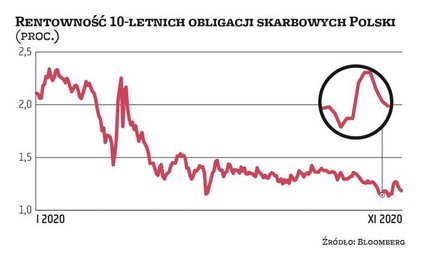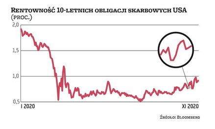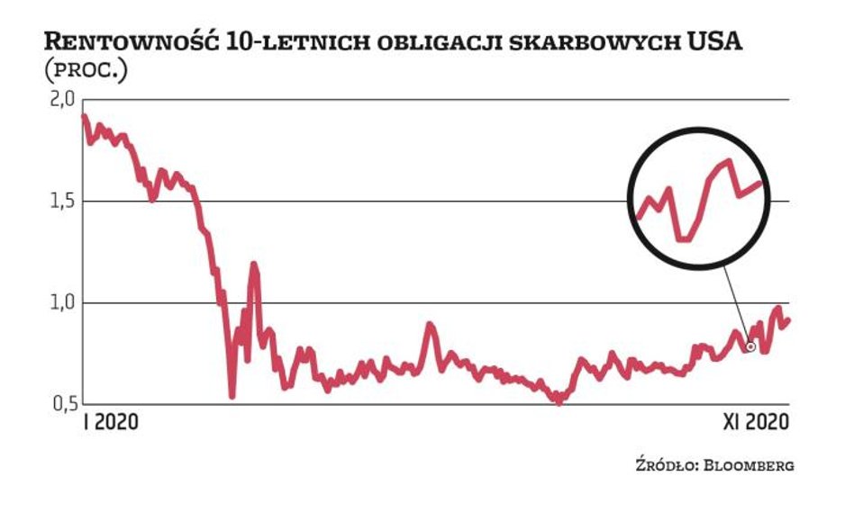 Poniedziałkowe doniesienia na temat wysokiej skuteczności szczepionki Moderny na Covid-19, podobnie jak te z zeszłego tygodnia na temat preparatu Pfizera i BioNTechu, doprowadziły do wzrostu apetytu inwestorów na ryzyko. Jego przejawem była przecena aktywów bezpiecznych, przede wszystkim obligacji skarbowych. Zjawisko to było najwyraźniej widoczne w USA, gdzie rentowność (porusza się w kierunku odwrotnym do cen) obligacji dziesięcioletnich w zeszłym tygodniu wynosiła nawet 0,98 proc., najwięcej od marca br., w porównaniu z niewiele ponad 0,8 proc. przed rewelacjami Pfizera. Tam poprawie nastrojów sprzyjały też wyniki wyborów prezydenckich. Na innych rynkach ten „reflacyjny" ruch – podyktowany wiarą w poprawę perspektyw gospodarek i w rezultacie oczekiwaniami na wyższą inflację i wyższe stopy procentowe – również był widoczny, choć na mniejszą skalę. Rentowność polskich 10-latek w ubiegłym tygodniu zbliżyła się do 1,3 proc., w porównaniu z niespełna 1,15 proc. tydzień wcześniej.
